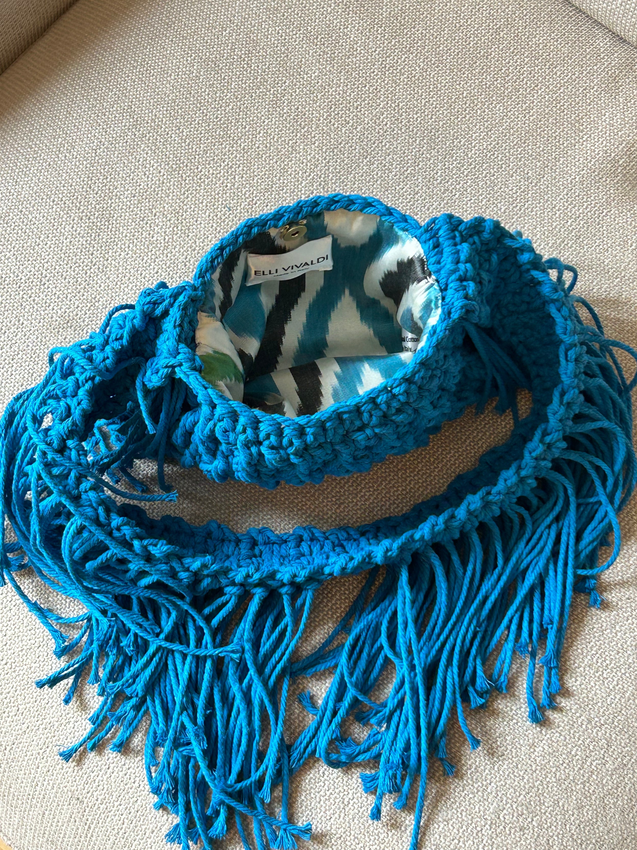 The Elli Bag is crafted entirely by hand in a refined crochet technique and finished with a unique lining in traditional Turkish silk ikat. Each handbag is distinguished by its own composition of color and craftsmanship quality.